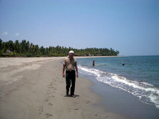 誰もいないと思ったら、砂浜をトボトボと水牛の親子がやって来た。毎日の散歩コースなのだろうか。この辺りの家では、ヤギ・ブタ・ニワトリなどが放し飼いで飼われている。この辺りは、ちょっとした動物園のようだ。 |