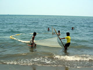 ビーチへ出ると、浜辺で漁をしていた。何が取れるのだろうか?子供たちも、漁を手伝っていた。 |